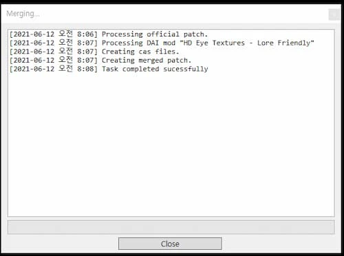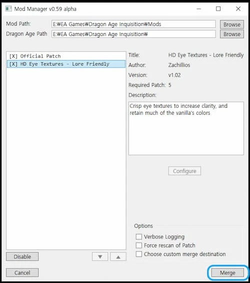 "Merge" 버튼으로 모드를 적용합니다.