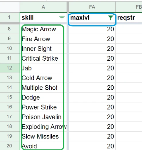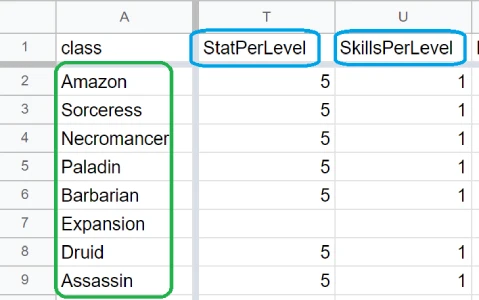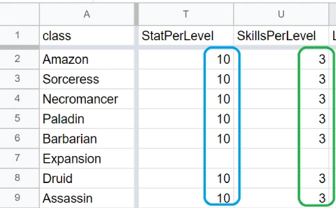 2. 첫번째 행에서 "StatPerLevel" 와 "SkillsPerLevel"를 찾습니다.