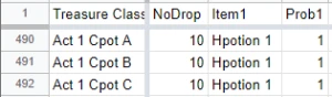 따라서 이 NoDrop 값을 9999 같은 값으로 증가하면 해당 Hpotion 1의 Nodrop 확률이 99.9%로 증가하기 때문에 드롭되지 않습니다.