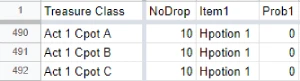 이 Hpotion 1은 또 다른 Treasure Class에 item으로 포함될 수 있습니다. 꼬리에 꼬리를 무는 방식입니다. 따라서 Hpotion 1을 포함하는 Class를 전부 찾아 Prob 값을 0으로 만듭니다.