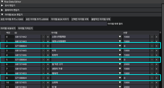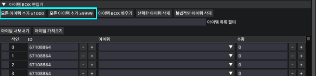 - 모든 아이템 치트(각 아이템을 X만큼 획득)