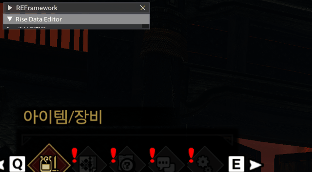 REFramework를 클릭해서 오버레이를 축소하여 "Rise Data Editor"가 나타나도록 합니다.