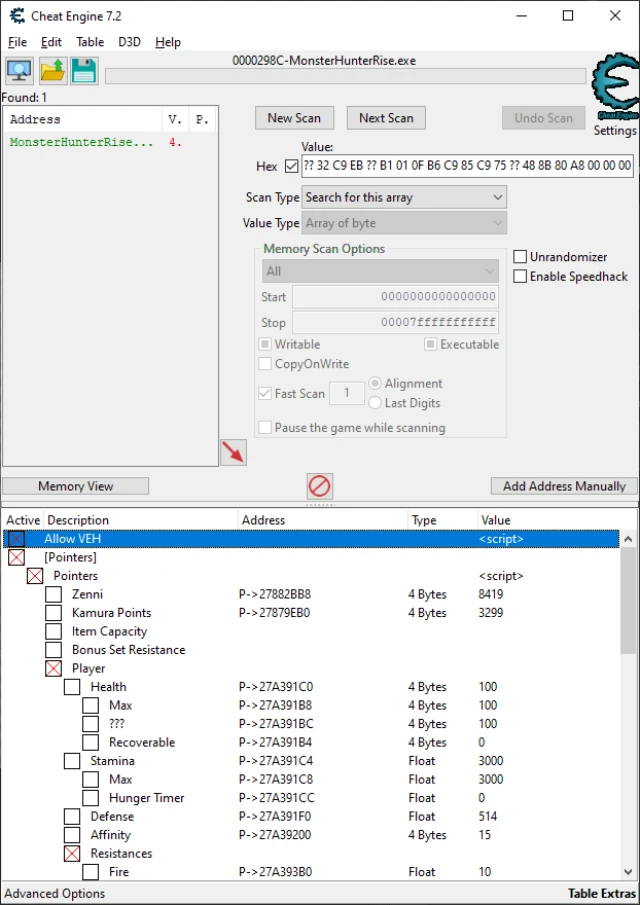 3. 치트 엔진을 사용하여 치트 테이블(MonsterHunterRise.CT)을 불러와 원하는 설정을 합니다.