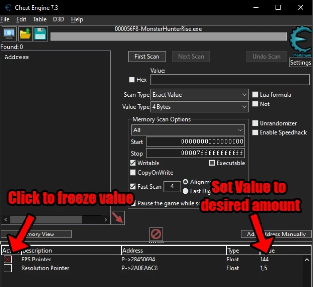 3. 치트 엔진을 사용하여 치트 테이블(RiseUnlockFPS+Res.CT)을 불러와 원하는 설정을 합니다.