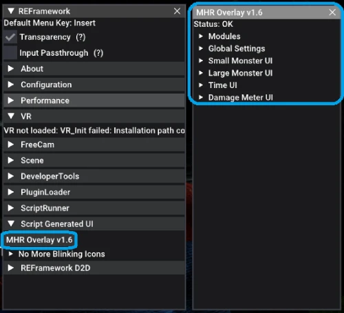 REFramework -> Script Generated UI -> MHR Overlay를 엽니다.