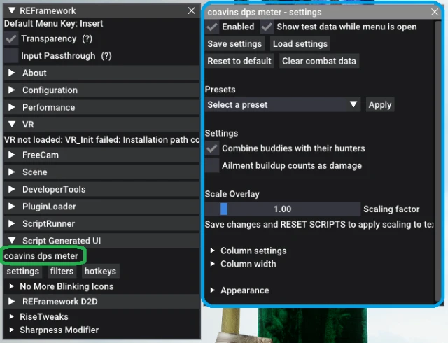 REFramework -> Script Generated UI -> coavins dps meter -> settings