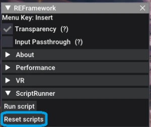 2. 게임을 실행 중에 이 모드를 설치했다면, "Reset scripts"를 클릭합니다.