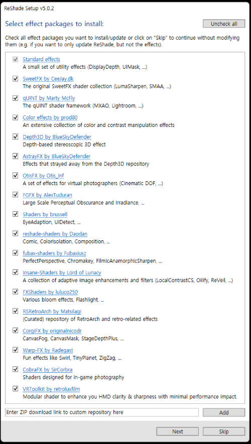 리쉐이드를 설치할 때, 모든 효과를 선택합니다.