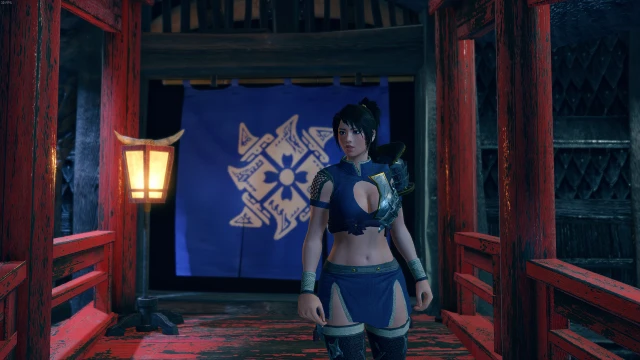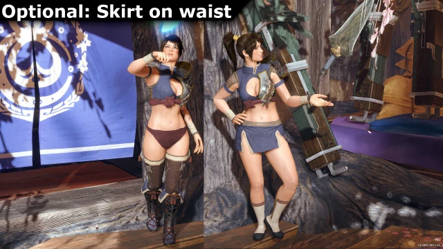 Reshapes the Kamura chest and legs to fit a more shapely body, and makes it more showy. Optionally moves the skirt to the waist slot or removes the pauldron.