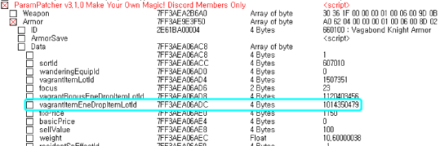 5. 강인도 값을 변경하기 위해 "vagrantItemEneDropItemLotId" 값을 설정합니다.