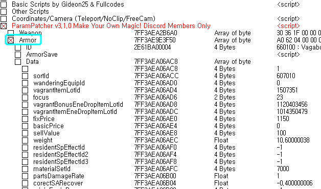 2. 치트 엔진에서 테이블을 불러오고 ParamPatcher > Armor 항목을 엽니다.