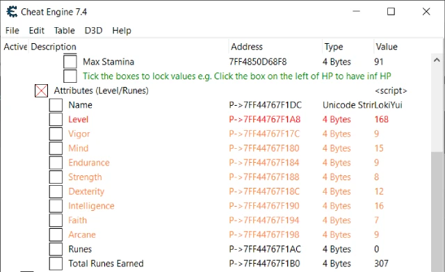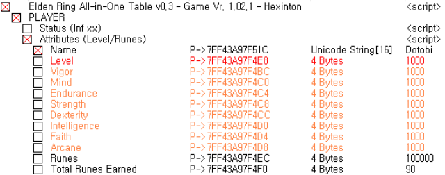 HP, Max HP, FP, Max FP, Stamina, Max Stamina를 변경할 수 있습니다.