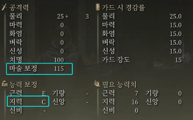 별점 지팡이는 기본값이 89로 설정되어있고 게임 내에서는 "마술 보정 115", "지력 C"로 나타납니다.