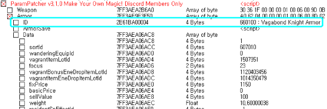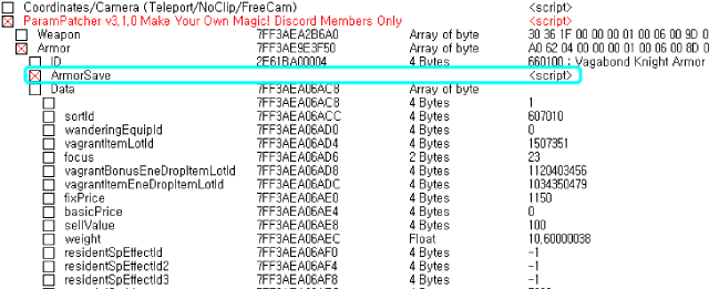 2. 치트 엔진에서 테이블을 불러오고 ParamPatcher > Armor 항목을 엽니다.