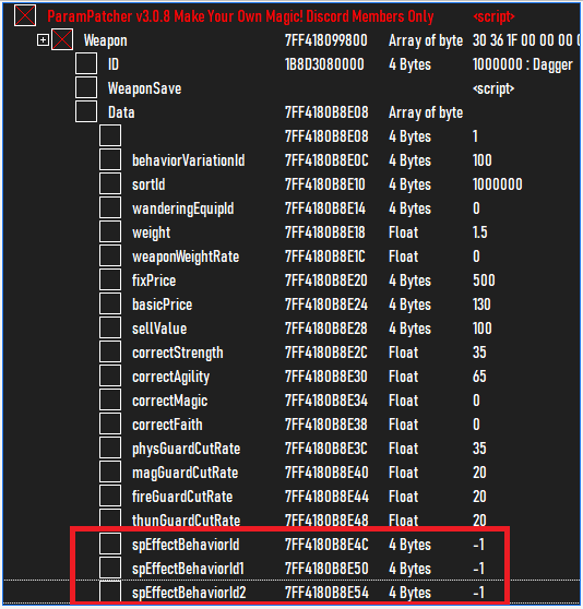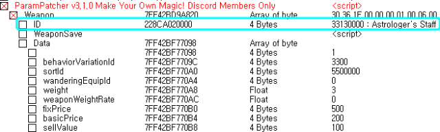 ITEM/EQUIPMENT (Add Item/Equip/Sorceries etc. ID Lists) -> Selected Weapon 이동합니다.