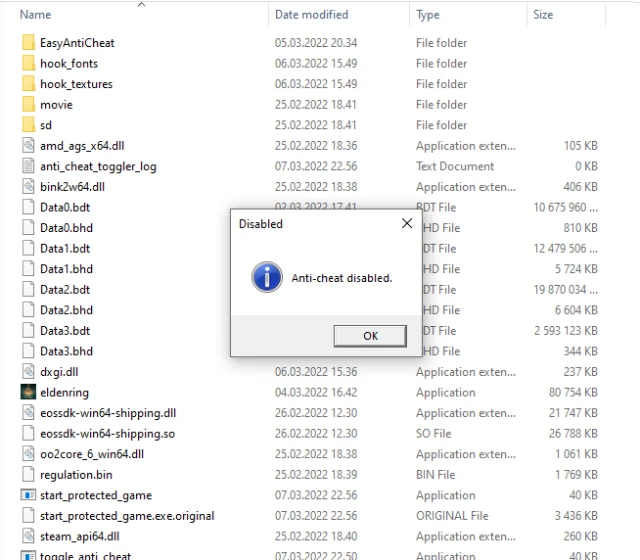 toggle_anti_cheat.exe 파일로 안티 치트를 활성화/비활성화 토글하지 않고, 바로 오프라인 모드로 엘든 링을 수행할 수 있습니다.