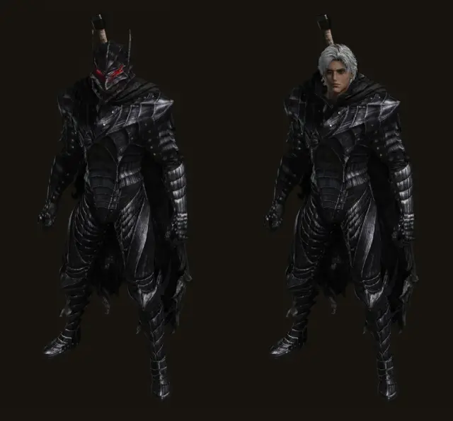 "밤 기병의 세트" 및 "그레이트 소드"를 베르세르크의 가츠 갑옷과 무기로 교체합니다.