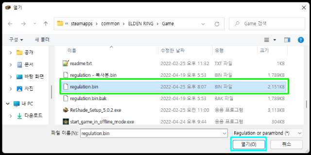 5. regulation.bin 파일을 엽니다.