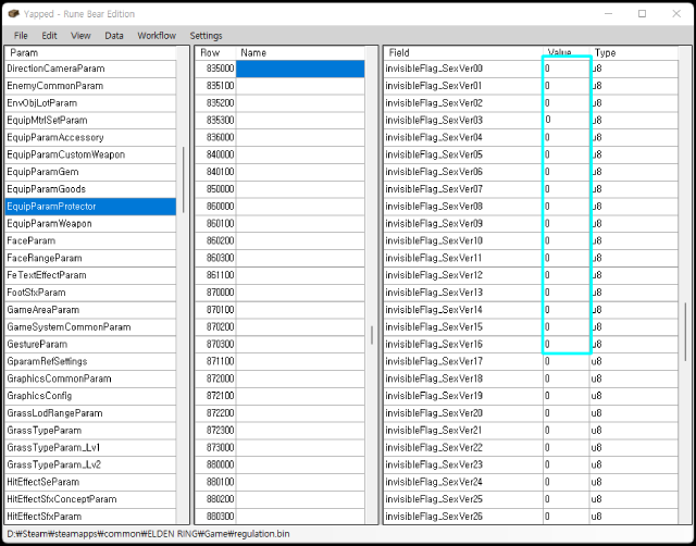 예시) EquipParamProtector 클릭 > 835000 클릭 > invisibleFlag_SexVer00부터 16까지의 값을 0으로 변경.
