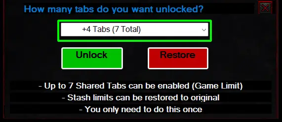 해당 모드를 다운로드 후 StashUnlockerExp.exe를 실행하고, 원하는 탭 수를 선택한 다음 저장 폴더를 선택합니다.