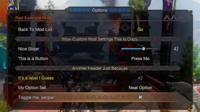 이 모드 자체로는 많은 것을 하지는 않습니다. 하지만 모드 작성자는 간단한 API를 통해 설정 메뉴를 인-게임 옵션 메뉴에 직접 추가할 수 있습니다.