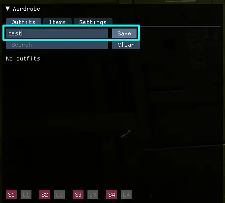 3. Outfits 탭에서 Outfit name을 입력하고, SAVE 버튼을 클릭하면 현재 장착한 의상을 저장할 수 있습니다.