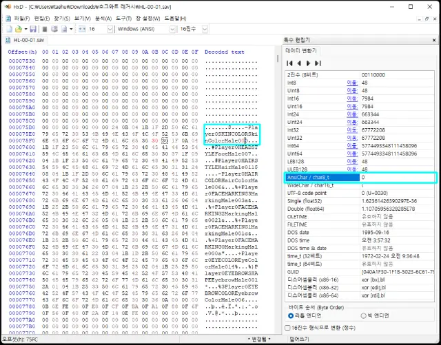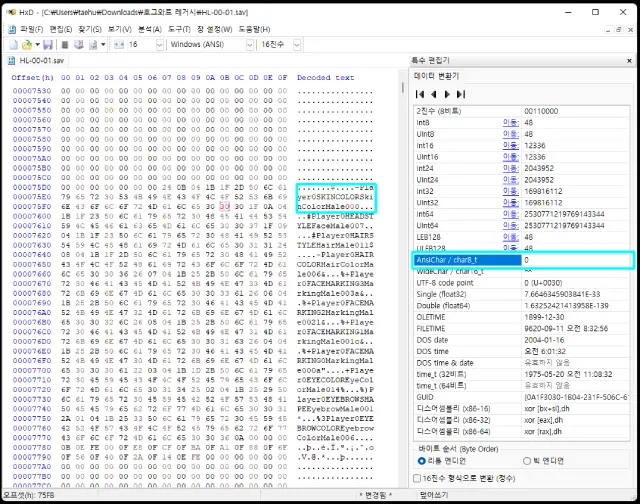 1의 자리를 변경하기 위해 0 앞에 커서를 둡니다. 그러면 데이터 변환기의 AnsiChar / char8_t 항목에 0이란 값을 확인할 수 있습니다.