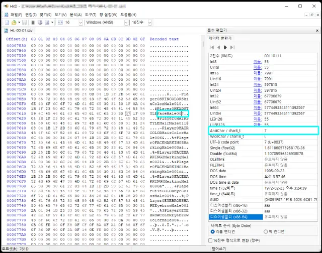먼저 숫자 7 앞에 커서를 둡니다. 그러면 데이터 변환기의 AnsiChar / char8_t 항목에 7이란 값을 확인할 수 있습니다.