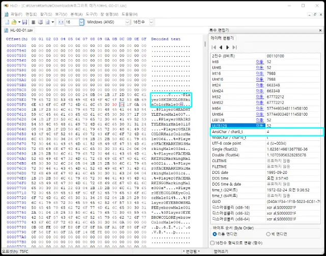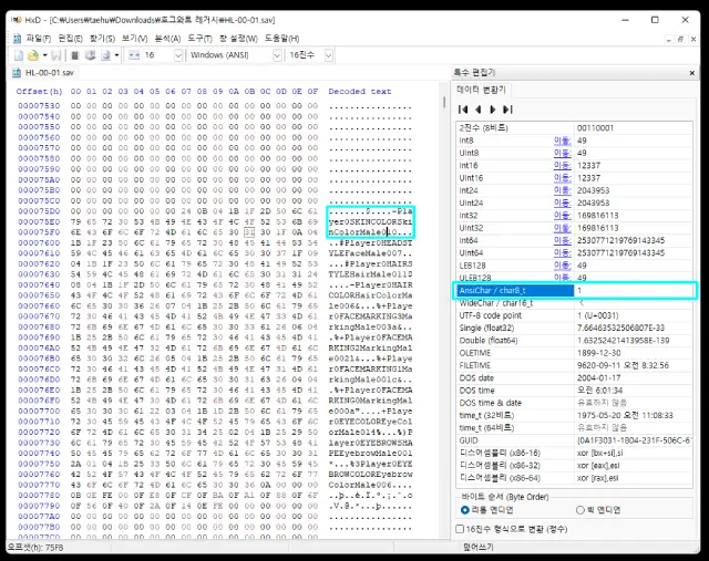 디코딩된 텍스트 열 "Player0HEADSTYLE" 바로 위에 "SkinColorMale010"와 같이 선택한 피부톤이 나옵니다.