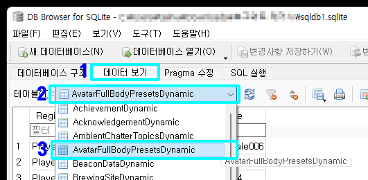 7-1. "데이터 보기" > "테이블" > "AvatarFullBodyPresetsDynamic"으로 이동합니다.