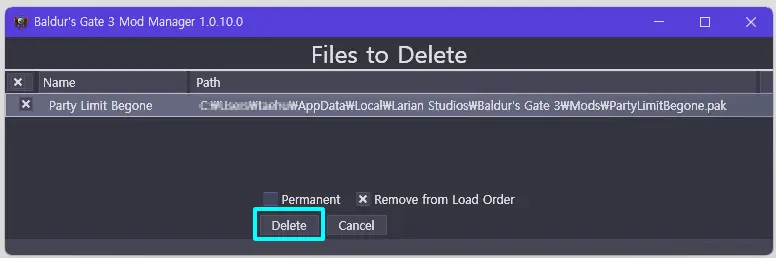 Permanent를 체크하면 모드 파일도 삭제합니다.