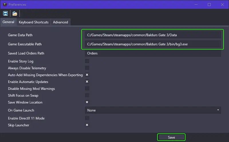 - Settings -> Preferences에서 게임 데이터 경로(Game Data Path)가 게임의 데이터 폴더(모든 다양한 .pak 파일이 있는 곳, 예: Gustav.pak 등)로 설정되어 있는지 확인하세요.