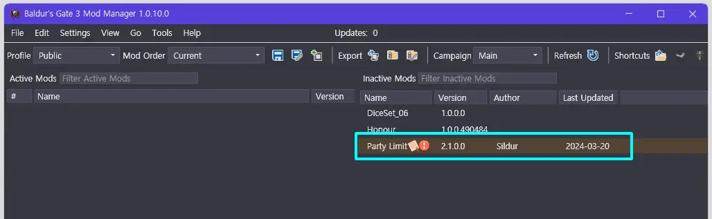 6. 프로필 Public에 대한 활성 모드를 정리한 다음, 첫 번째 내보내기 버튼(Export Load Order to Game)을 클릭하거나, File -> Export Order to Game를 클릭하여 활성 로드 순서를 게임으로 내보냅니다. 이 작업은 게임이 읽는 modsettings.lsx 파일을 업데이트합니다.