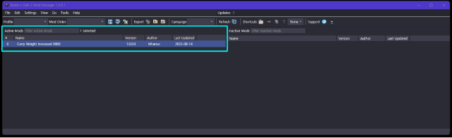- 캠페인이 선택되어 있는지 확인하세요(예: "Main"). 게임은 modsettings.lsx로 내보낼 캠페인이 있어야 하며, 그렇지 않을 경우 메인 메뉴 장면을 로드하지 못하거나 다른 문제가 발생할 수 있습니다.