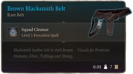 사용 가능한 비주얼은 아이템 설명에 나열되어 있으며, 예제 아이템인 Brown Blacksmith Belt에서 확인할 수 있습니다.