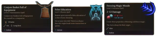 바구니 아이템에는 사용자 지정 및 수정된 주문도 포함되어 있습니다. 가장 중요한 주문은 "장비로 가득 찬 바구니 소환(Conjure Basket Full of Equipment)"입니다. 이 주문으로 새로운 바구니를 소환할 수 있습니다. 또 다른 흥미로운 주문은 "허위 교육(False Education)"으로, 대화 선택 시 캐릭터에 다른 직업 태그를 일시적으로 추가할 수 있습니다.