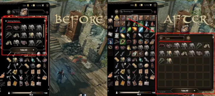 - 이 게임은 컨테이너의 모델 위에 컨테이너의 패널을 렌더링 하려고 합니다. 즉, 스케일링을 시작하면 더 이상 캐릭터와 컨테이너를 볼 수 없습니다. 또한 인벤토리 패널을 소환하면 컨테이너가 항상 겹칩니다. 이 모드는 패널을 컨테이너 오른쪽 약간 아래에 렌더링 하여(주의: 항상 그런 것은 아니며, UI 공간이 충분한 경우에만) 컨테이너의 아이템을 호출할 때 인벤토리 패널로 드래그 앤 드롭할 수 있도록 준비합니다.