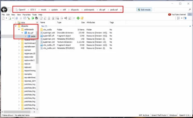 5. 다운로드한 모드 중 원하는 스킨을 peds.rpf 폴더 아래에 복사합니다. (OpenIV에서 복사)