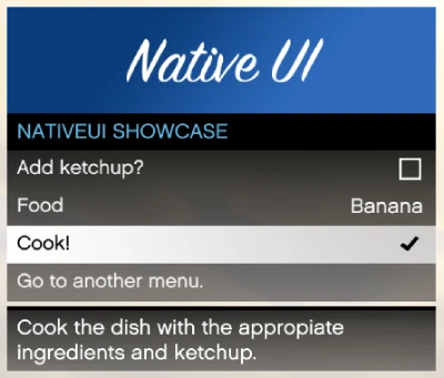 NativeUI Library Download 1.9.1 ScriptHookVDotNet based library for easy and fast Rockstar-like menus. Features: Support for simple buttons, checkboxes and lists. Support for custom banners from game sprites and your own textures. Easy nested menus for fas