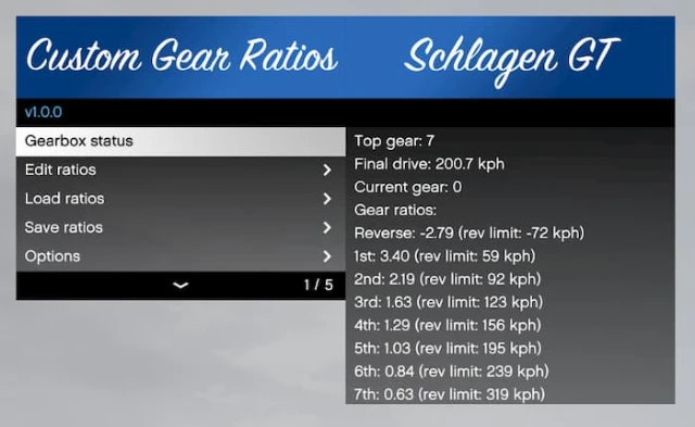 Custom Gear Ratios Tired of Rockstar borking the code and making your car slow down after the 6th gear? Tired of not being able to get out of the 9th gear in Arena Wars? Here's your fix! Features Edit gear ratiosEdit final driveEdit number of gearsSave pre