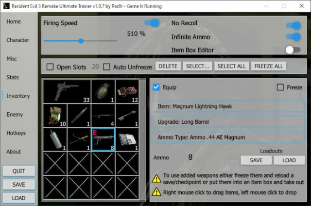 - 중요: 새로운 메인 게임을 시작한 후에 얻는 무기를 교체해서는 안됩니다! 이것은 게임을 소프트 락 (무한 로딩 화면) 할 가능성이 높습니다. 아이템 (탄약, 허브, 열쇠) 교체는 안전합니다. 새로운 게임(권총, 나이프, 샷건, SMG 등)을 시작할 때 플레이어에게 제공되는 무기만 교체 가능합니다.