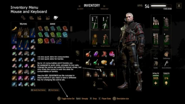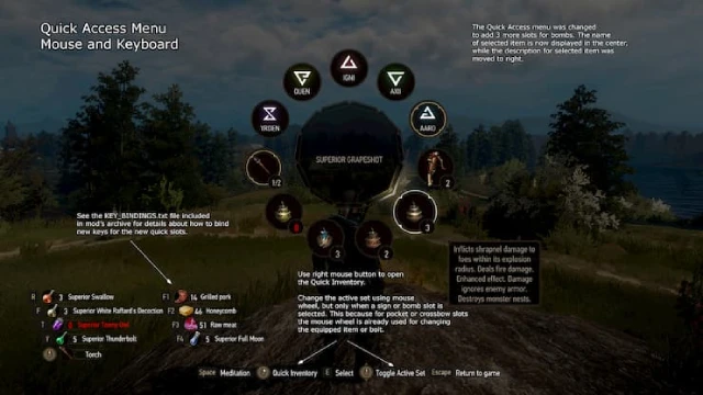 활성 세트는 마우스 휠을 사용하여 변경할 수 있습니다. 인벤토리 메뉴에서 마우스 커서는 소모품 또는 폭탄 슬롯 위에 있어야 하며, 퀵 접근 메뉴에서는 표식 또는 폭탄 슬롯을 선택해야 합니다. 소지품 및 석궁 슬롯의 경우 마우스 휠이 이미 장착된 아이템이나 화살을 변경하는 데 사용되기 때문입니다. 이를 위해 왼쪽 시프트, 왼쪽 컨트롤 또는 마우스 버튼과 같은 다른 키를 할당할 수도 있습니다.