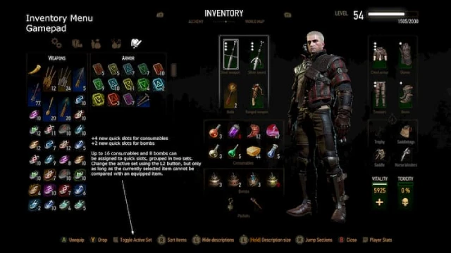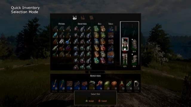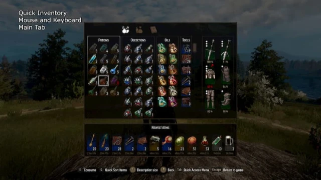 소모품과 폭탄의 퀵 슬롯 수가 두 배로 늘어납니다. 물약이나 탕약을 마시고, 오일을 바르고, 장착된 아이템을 보고 수리하고, 음식을 먹거나 책을 읽을 수 있는 빠른 인벤토리를 제공합니다.