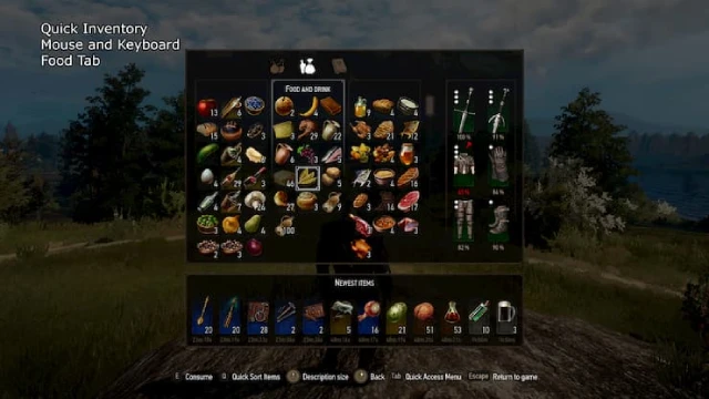 또 다른 주요 기능은 플레이어가 물약이나 탕약을 마시고, 기름을 바르고, 장착된 항목을 보고 수리하고, 음식을 먹거나 책을 읽을 수 있는 빠른 인벤토리 HUD(Quick Inventory HUD) 모듈입니다. 또한 빠른 인벤토리에는 최근 받은 12 개의 아이템 목록이 포함되어 있습니다.