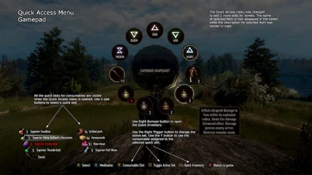 바닐라 게임과 가장 큰 차이점은 퀵 접근 메뉴를 열면 소모품의 모든 퀵 슬롯이 HUD에 표시된다는 것입니다. D 패드 버튼을 사용하여 빠른 슬롯을 선택할 수 있습니다. Y 버튼을 눌러 선택한 퀵 슬롯에 할당된 소모품을 마시거나 먹습니다.