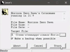 2. Target File 항목에 호라이즌 제로 던 설치 경로를 지정하고 Start를 클릭합니다.