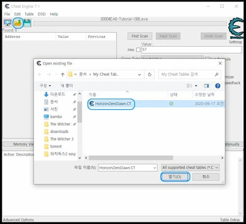 6. 해당 모드에서 다운로드한 치트 엔진 테이블을 불러옵니다.