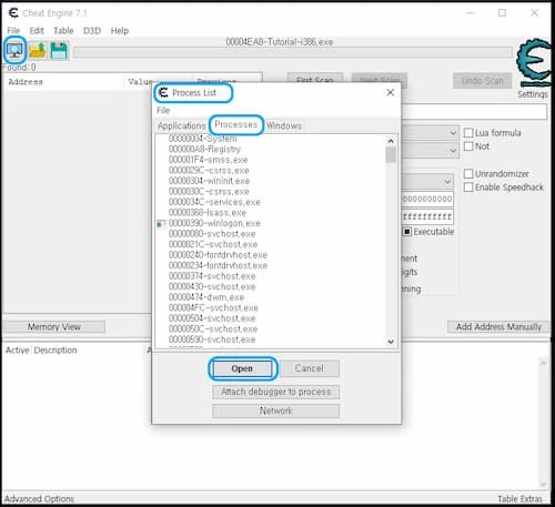 3. "프로세스 열기(Open Process)" 아이콘을 클릭합니다 ( "파일" 아래에 있는 왼쪽 상단 아이콘)