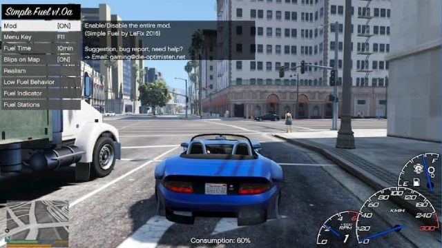 Simple Fuel Mod -development stopped- Features -Fuel tank for all road vehicles (exclusive), supports add-on cars -Working fuel gauge on vehicle dashboard -Throttle/RPM based consumption (Global consumption factor can be changed using mod menu) -Refueling