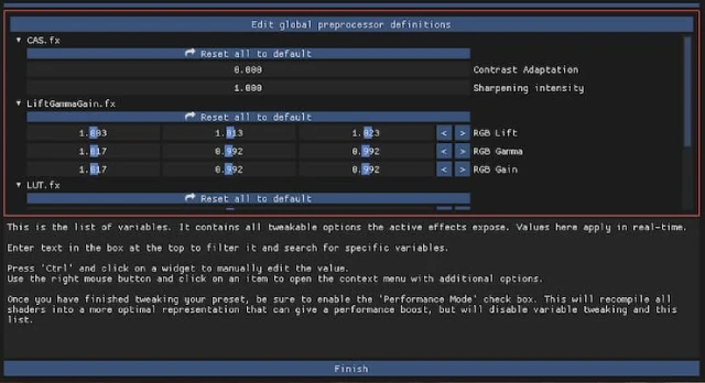 프리셋 조정을 마쳤으면 '성능 모드(Performance Mode)' 확인란을 활성화해야 합니다. 이렇게 하면 모든 셰이더 성능을 향상할 수 있는 최적의 표현으로 다시 컴파일하지만, 변수 조정 및 이 목록을 비활성화합니다.